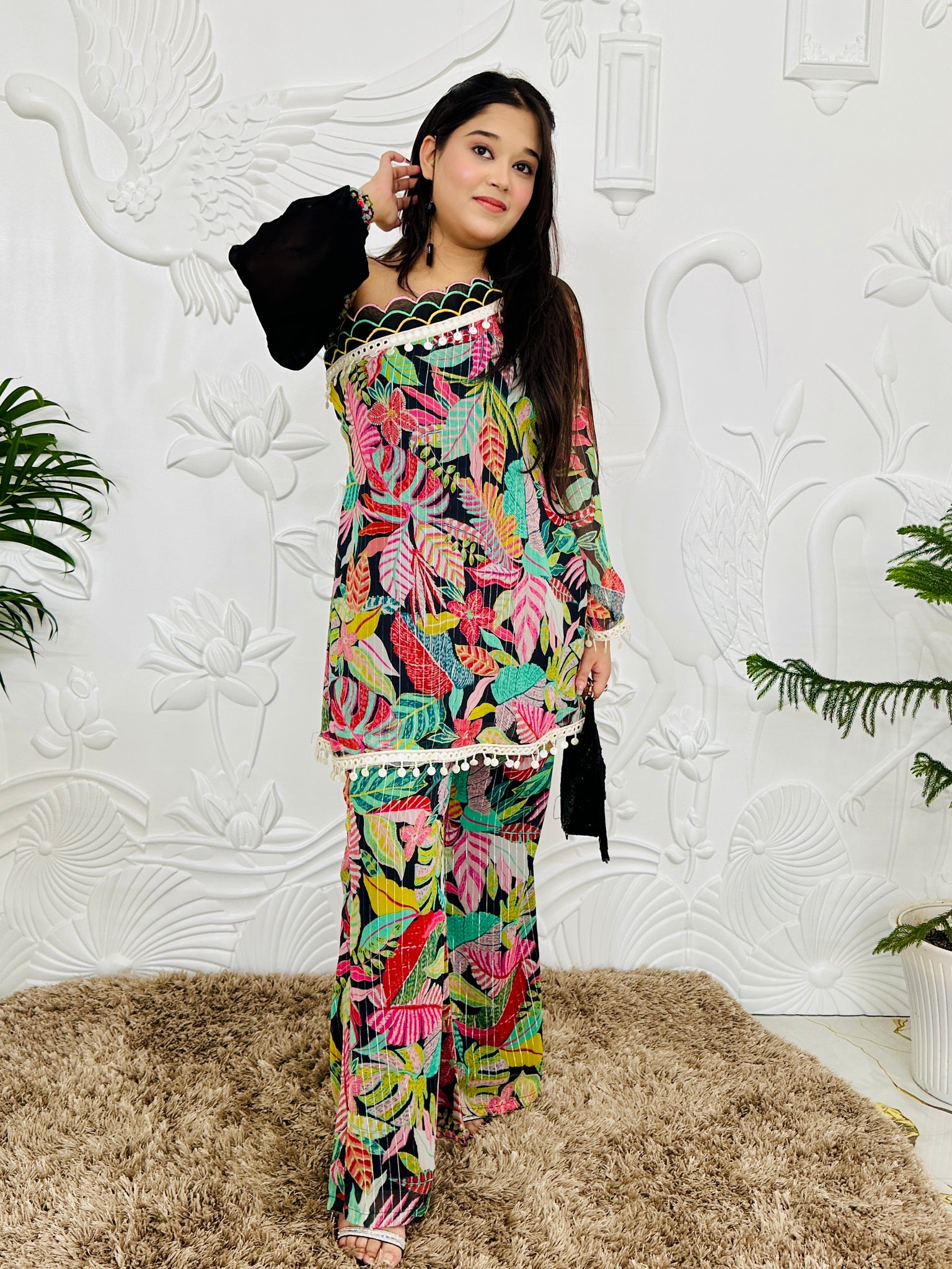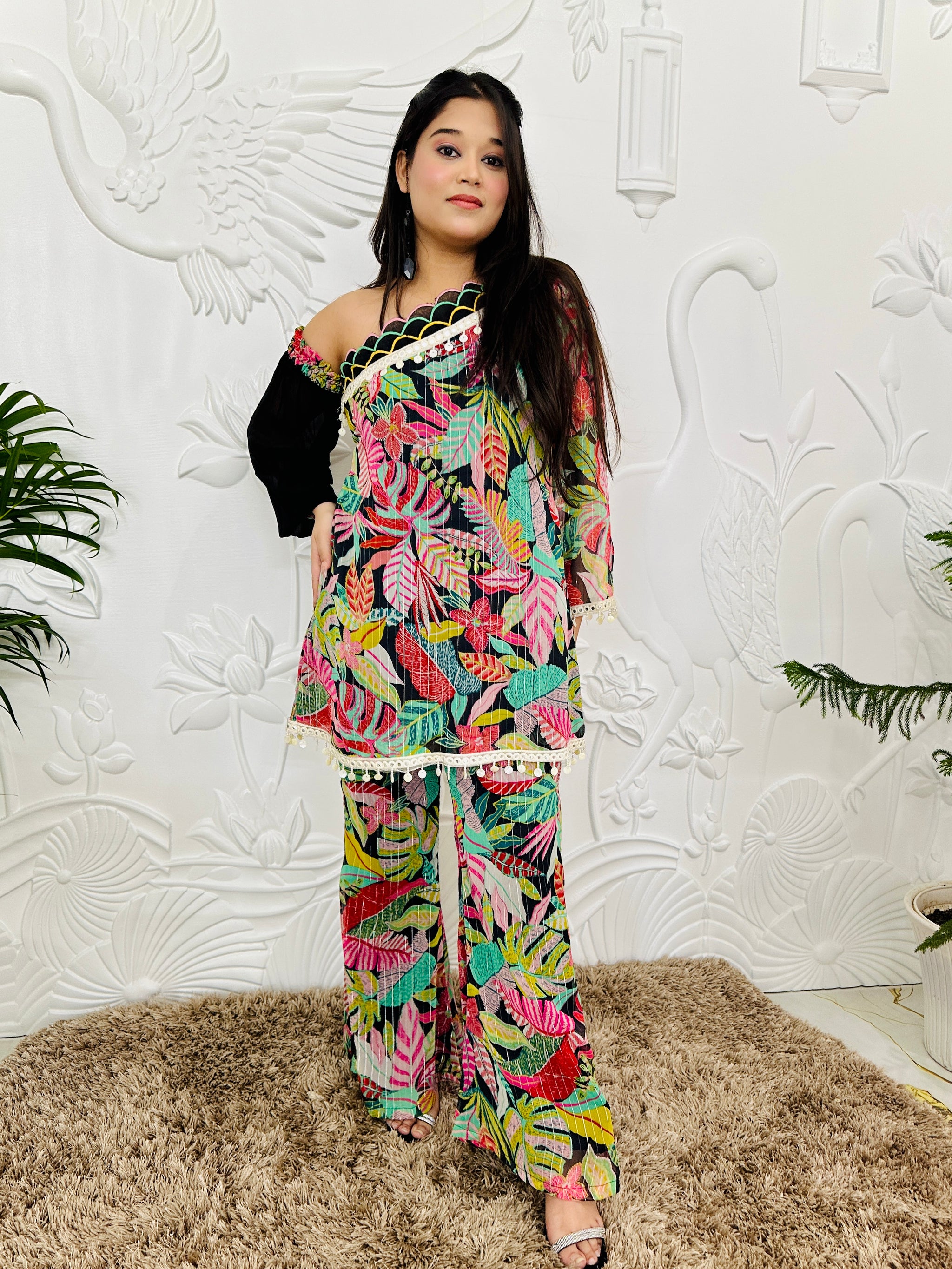 Turn heads in this designer off-shoulder co-ord set, crafted for the perfect mix of sass and elegance. The off-shoulder neckline adds a flirty charm, while the co-ord silhouette keeps it chic and trendy. Breezy, playful, and full of girlish grace – this outfit is your go-to for parties, brunches, and every moment you want to sparkle in style.