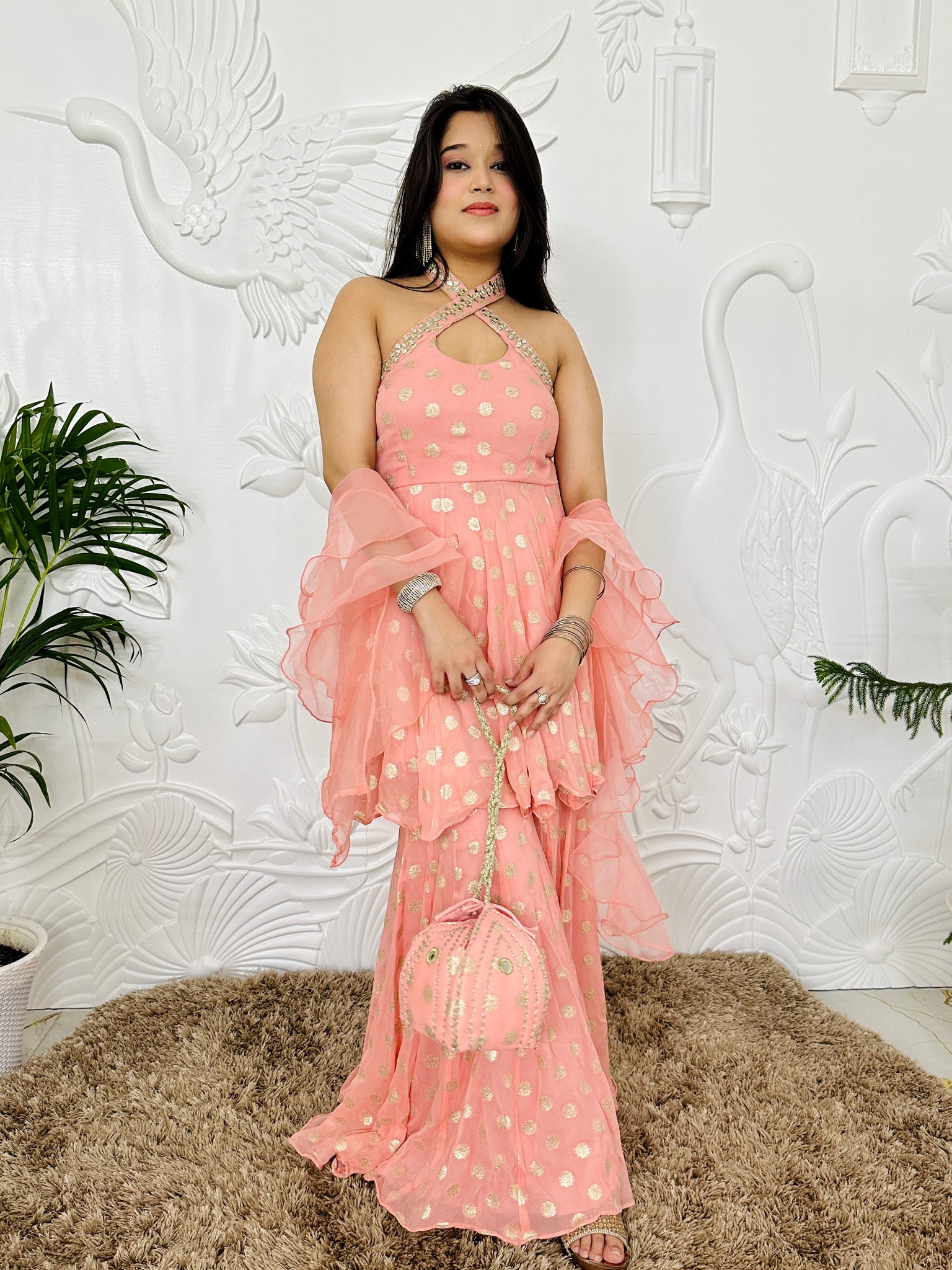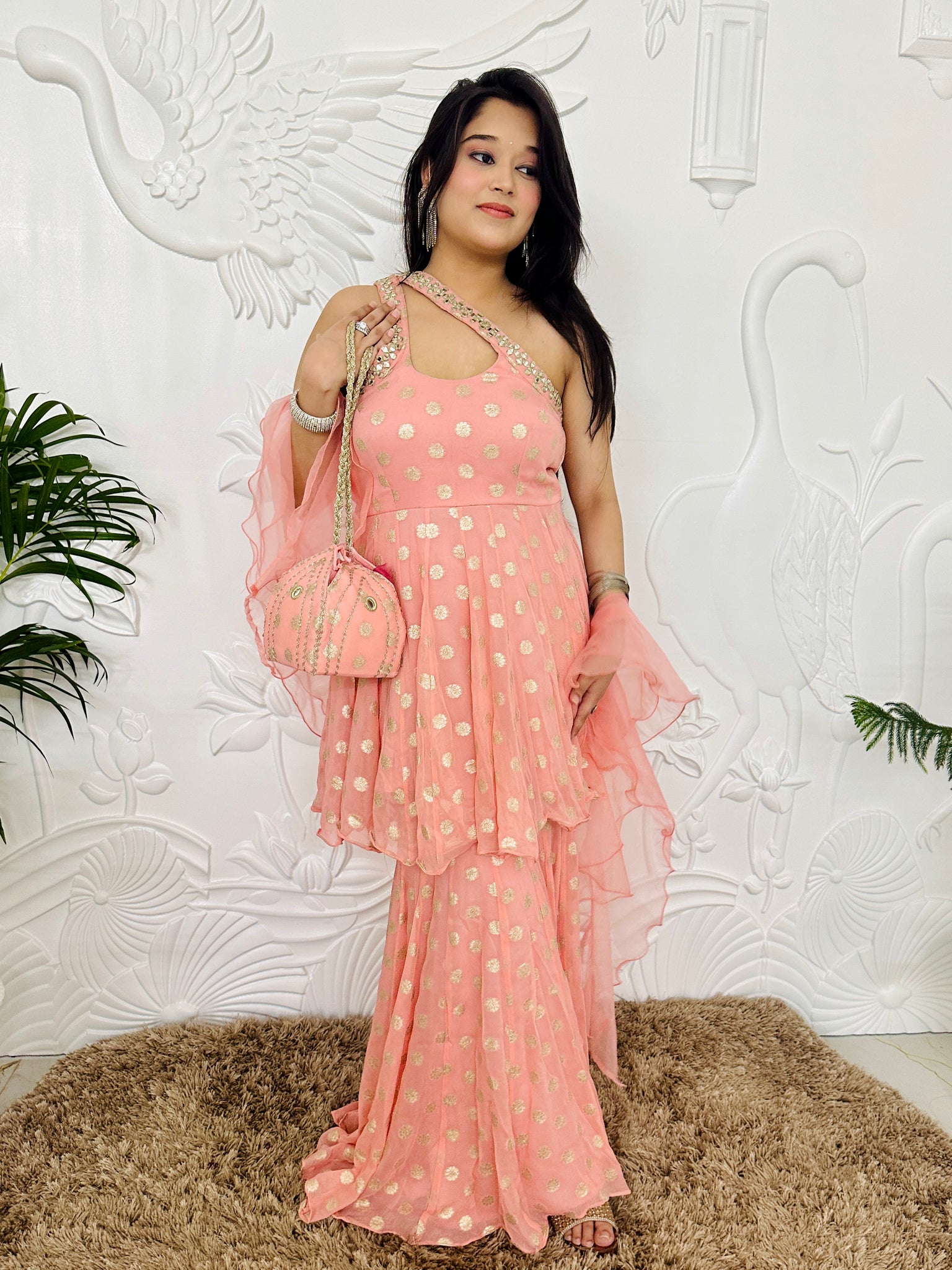 Designer Short Anarkali with Sharara – A stunning fusion ensemble featuring a chic short anarkali adorned with intricate embellishments, paired with a flowy sharara for a regal yet modern vibe. The look is completed with a statement ruffle dupatta adding layers of elegance, and a beautiful matching potli bag for that perfect festive touch.